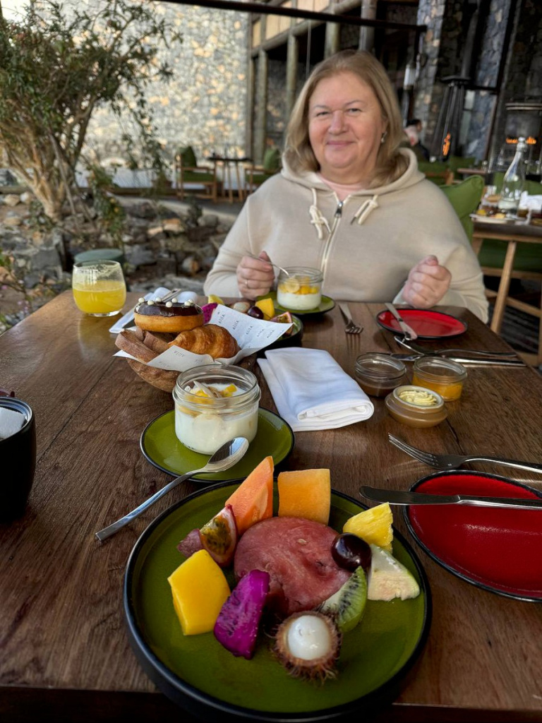 Наши коттеджи из камня и дерева буквально сливались с горным ландшафтом: архитектор придал им черты традиционных жилищ горцев. Лишенный показной суеты арабский сервис, охристо-землистые краски, минимализм и завидное качество всего, что предлагает отель — от густых смузи и уносящих в мир грез десертов до терпкого парфюма и тончайшего постельного белья — помогали не отвлекаться от главного, ради чего мы здесь оказались: встречи с собой и природой.